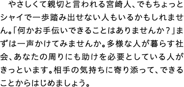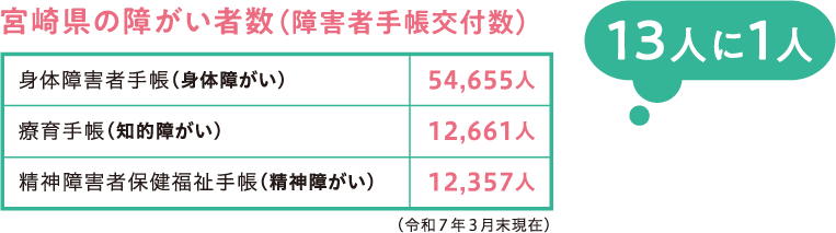 宮崎県には現在、約8万人の障がい者が暮らしています※。これは県民の13人に一人の割合。超高齢社会である今、年を重ねれば何かしら身体に支障が出てきますし、明日事故に遭って不自由な身体になるかもしれません。