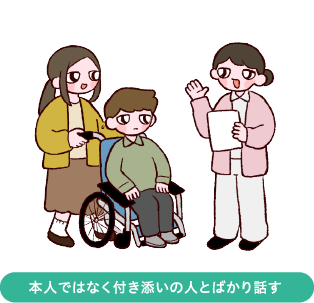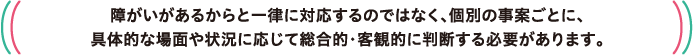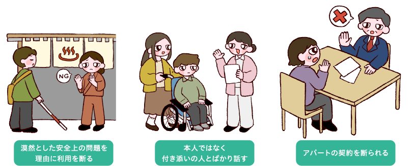 障がいがあるというだけで、正当な理由なく、サービスの提供を断ったり、条件を付けたりすることは、「不当な差別的取扱い」にあたります。