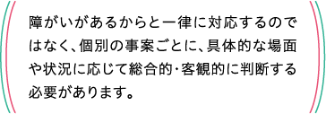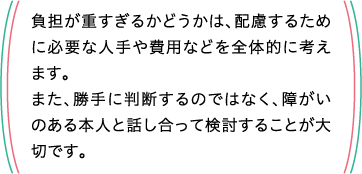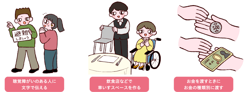 障がいのある人にサービスを提供するとき、障がいのある人から「手助けが必要です」と言われた場合、負担が重すぎない範囲で対応することです。