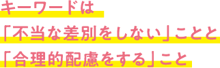 改正障害者差別解消法(2024年4月1日施行)では、「不当な差別的取扱をしてはならない」ことと「合理的配慮の提供」をしなければならないことが行政機関および民間事業者に義務づけられています。