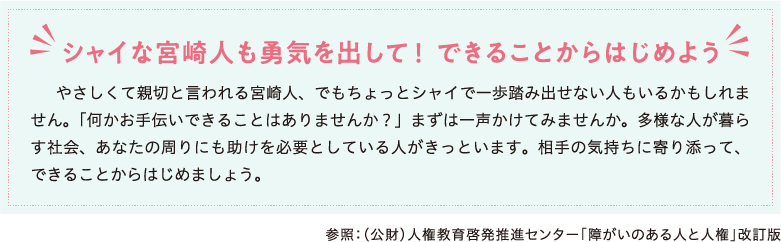 宮崎県には現在、約8万人の障がい者が暮らしています※。これは県民の13人に一人の割合。超高齢社会である今、年を重ねれば何かしら身体に支障が出てきますし、明日事故に遭って不自由な身体になるかもしれません。